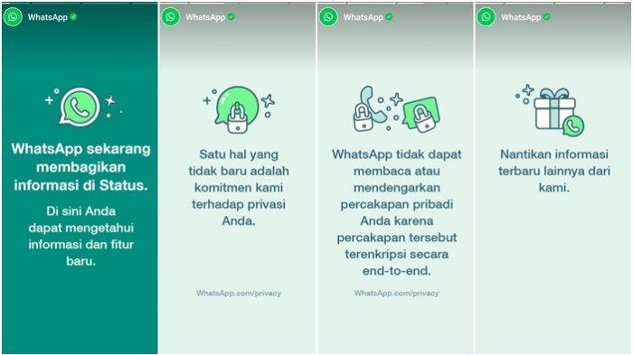 Pesan pertama tertulis, "WhatsApp sekarang membagikan informasi di status. Disini anda dapat mengetahui informasi dan fitur baru"