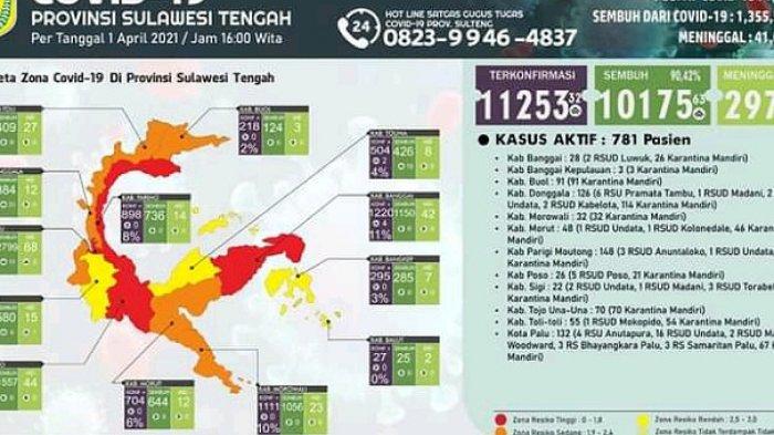 TRIBUNPALU.COM, PALU - Pusat data dan informasi (Pusdatina) COVID-19 Sulawesi Tengah merilis perkembangan penanganan Covid-19 per 1 April 2021.