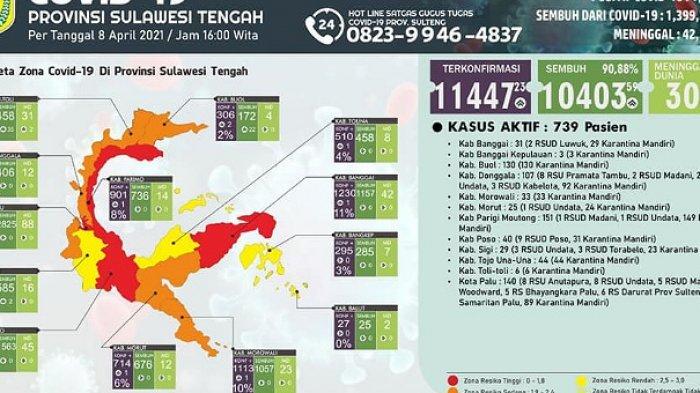 TRIBUNPALU.COM, PALU - Pusat data dan informasi (Pusdatina) COVID-19 Sulawesi Tengah merilis perkembangan penanganan Covid-19 per 8 April 2021.