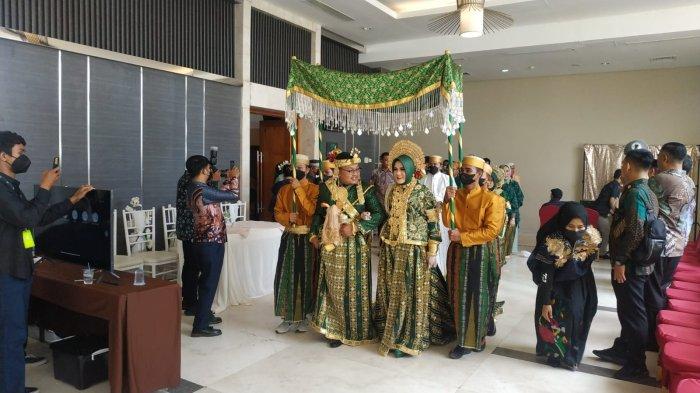 Pangan Sultan Beybar dan Ayustina dipayungi dan disambut penari tradisional sebelum memasuki gedung Akad Nikah, Sabtu (21/5/2022).