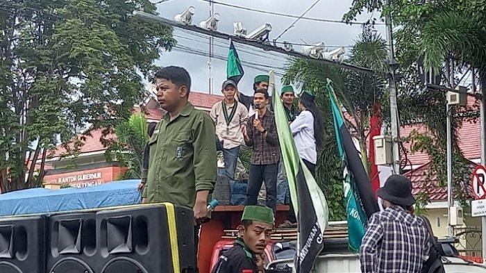 Pantauan TribunPalu.com, massa aksi mengenakan atribut peci dan gordon khas HMI sambil membentangkan spanduk berisi tuntutan.