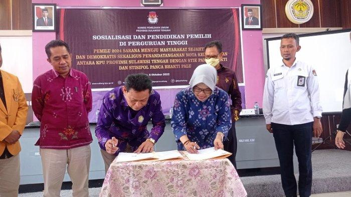KPU Sulawesi Tengah melakukan penandatangan nota kesepahaman dengan kedua universitas ini untuk mendorong peningkatan pemilih dalam pemilihan serentak tahun 2024 mendatang di Aula STIE Palu, Kamis (6/10/2022).