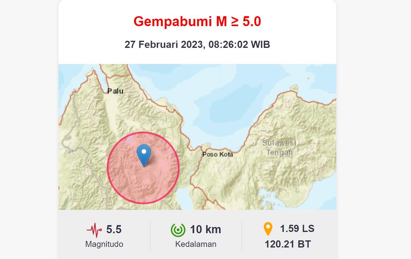 Gempa bumi dengan Magnitudo 5,5 terjadi di wilayah Sigi, Sulawesi Tengah, Senin 27 Februari 2023.