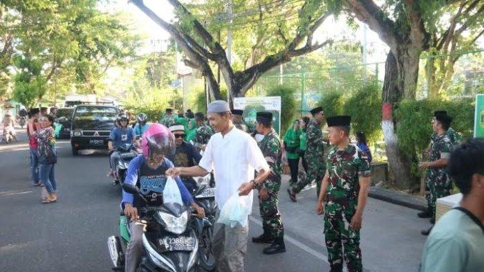 TRIBUNPALU.COM, BANGGAI - Kodim 1308/Luwuk Banggai membagikan Takjil kepada pengendara yang melintas di depan Makodim, Jl Samratulangi Kelurahan Bungin, Kecamatan Luwuk, Kabupaten Banggai, Sulswesi Tengah, Sabtu (30/03/2024).
