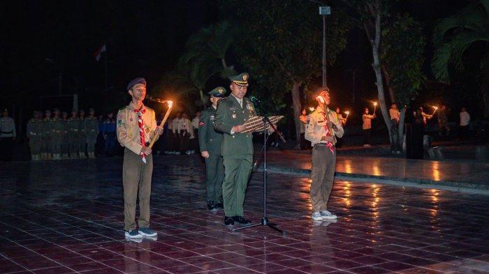 Diapit oleh dua anggota pramuka yang membawa obor sebagai penerang, Inspektur Upacara membacakan naskah Apel Kehormatan dan Renungan Suci.