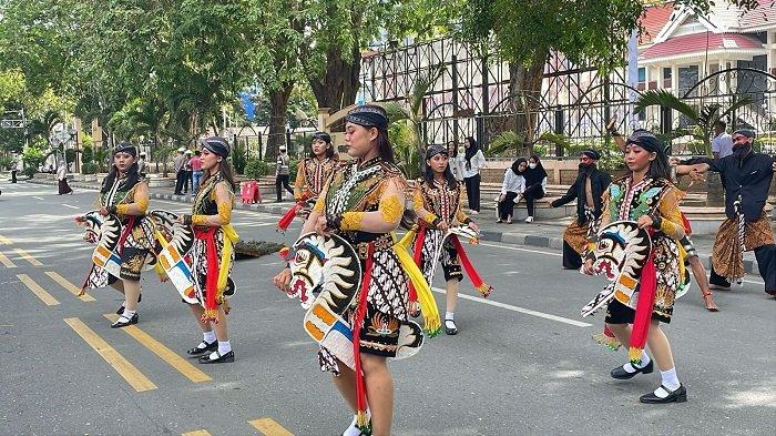 Aksi pertunjukan seni tersebut dibawakan oleh sanggar seni Singo Manggolo Mudho di bawah naungan Kerukunan Keluarga Jawa Sulawesi Tengah (KKJST).