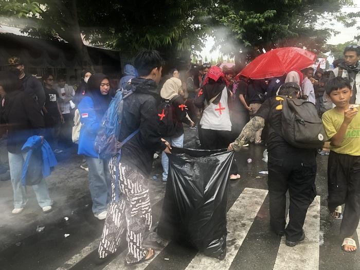 Ketika mahasiswa berhasil memasuki gedung DPRD Sulawesi Tengah, aksi pungut sampah tetap dilakukan di sekitar lokasi.