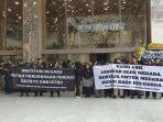 Demonstran mengenakan pakaian serba hitam dengan membawa sejumlah spanduk bertuliskan isi kecaman.